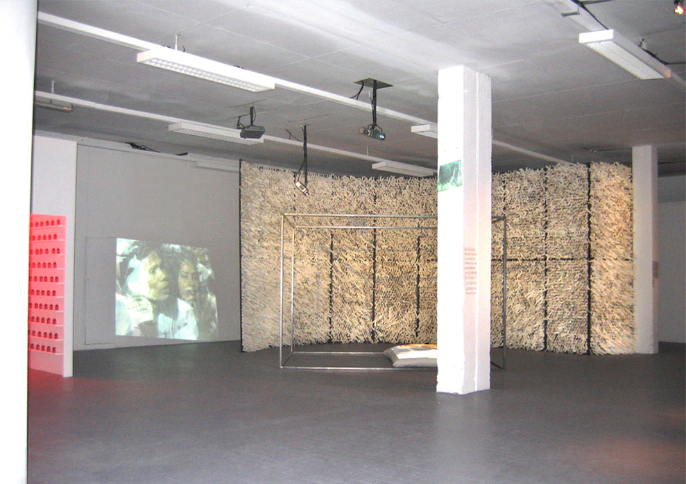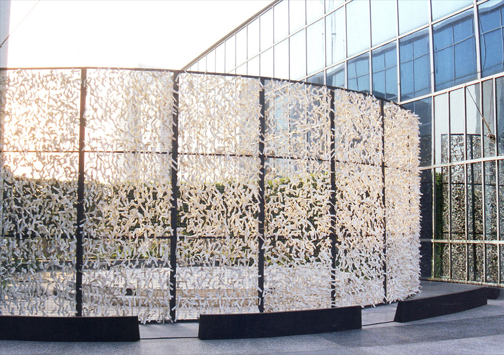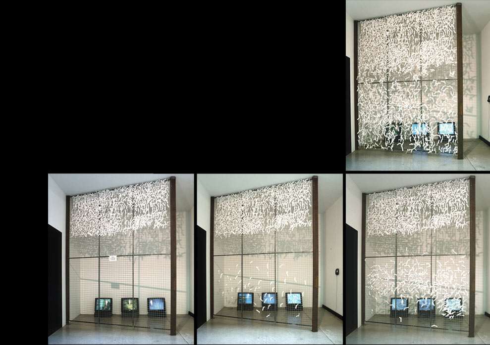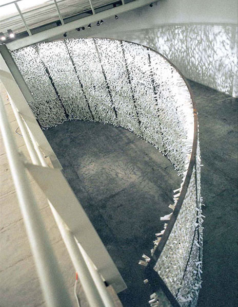 The paper ribbons contain superimposed text. The text incorporated from various national and international publications include creative writings, historical documentation, and journals, sociological and psychoanalytical studies related to the subject.
