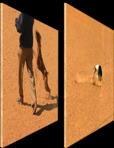 …More than making one react to the virtual motion of the video image, it is to compel to physical movement, the viewer confronts the image of the dog in slow motion being trained to snatch or “catch” a ball on screen one, as behind it on two facing screens the film shows in synchronization a boy catch a bouncing ball on one ,fall and pick himself again on another, the sound of a dog barking and the bouncing of a ball come up at intervals from two different films and from different heights. The viewer has to shift attention, look, and then step and turn accordingly. Spectator’s psychology leads him or her to the meaning of the image by evincing responses whose sensations are bodily embedded. The visual aspect of the work blending direct but blurred reality with a sparingly fine painter less helps one realize that against the prevalent fixation with competitiveness and winning, life deserves to be enjoyed with spontaneity and sometimes irrespective of its outcome.