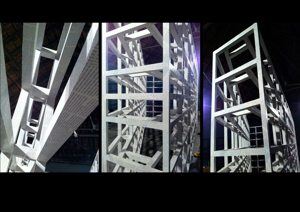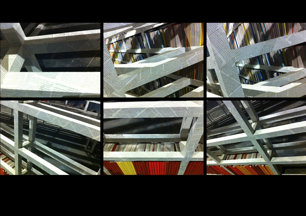 Books are made of old newspapers and environmental periodicals. Each book has text designed by the artist only on one page.